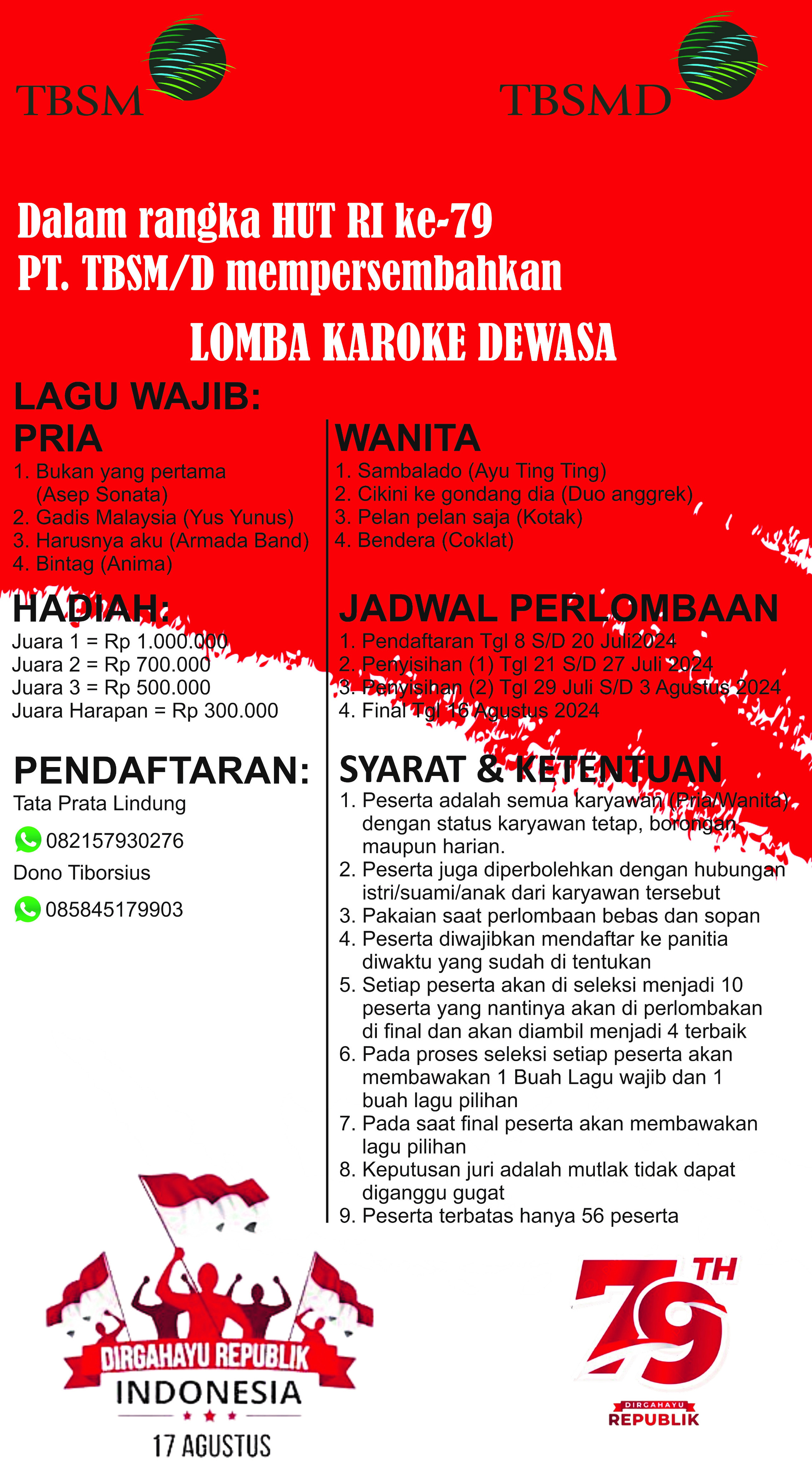 Pendaftaran : 082157930276 (Tata) dan 085845179903 (Dono)